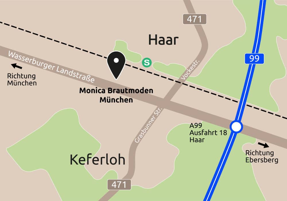 Zentral gelegen, schnell zu erreichen – unser Geschäft für Brautmoden München befindet sich nur wenige Kilometer östlich der Münchner Innenstadt an der B304 / Münchener Straße / Wasserburger Straße in der Gemeinde Haar. Vom Münchner Zentrum sind Sie in einer Viertelstunde bei uns. Die nächstgelegene Haltestelle der S-Bahn-Linie 4 befindet sich sechs Fußminuten entfernt in Haar. Als Autofahrer nutzen Sie am besten die kostenlosen Parkplätze vor unserem Modegeschäft. Wir freuen uns auf Ihren Besuch!