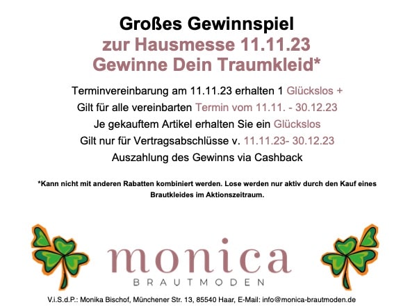 Wir freuen uns, Sie zur unserer Hochzeitsveranstaltung des Jahres einzuladen - unsere Hausmesse im Fachgeschäft Monica Brautmoden. Es wird ein unvergesslicher Tag voller Inspiration, Eleganz und aufregender Überraschungen sein.